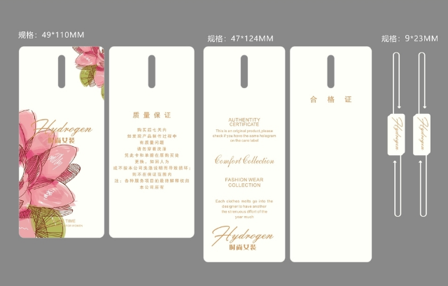 盡管每個服裝企業(yè)的吊牌各具特色,但大多在吊牌上印有廠名、廠址、電話、郵編、徽標(biāo)等。有些企業(yè),還要印上公司的性質(zhì)(如中外合資、獨資等);還有的服裝廠家則干脆把小小的吊牌,視為一張縮微的“廣告”,把名模靚女身著自己產(chǎn)品的照片印在了上面,給人以更直觀的感受,使消費者對自己的產(chǎn)品有更深刻的印象,起到了很好的宣傳促銷作用;還有些廠家,為感謝消費者購買了自己的產(chǎn)品,往往還要在吊牌上印上鳴謝、祝愿的話語,給人以親切感;有的吊牌則更象一張“產(chǎn)品使用說明書,因為上面不僅印有產(chǎn)品是要用何種面料,其性能如何,甚至還要把洗滌服裝的水溫、洗滌方式.何種類型的清洗劑以及如何保養(yǎng)都要印在吊牌上,可見廠商對消費者是十分負(fù)責(zé)的。